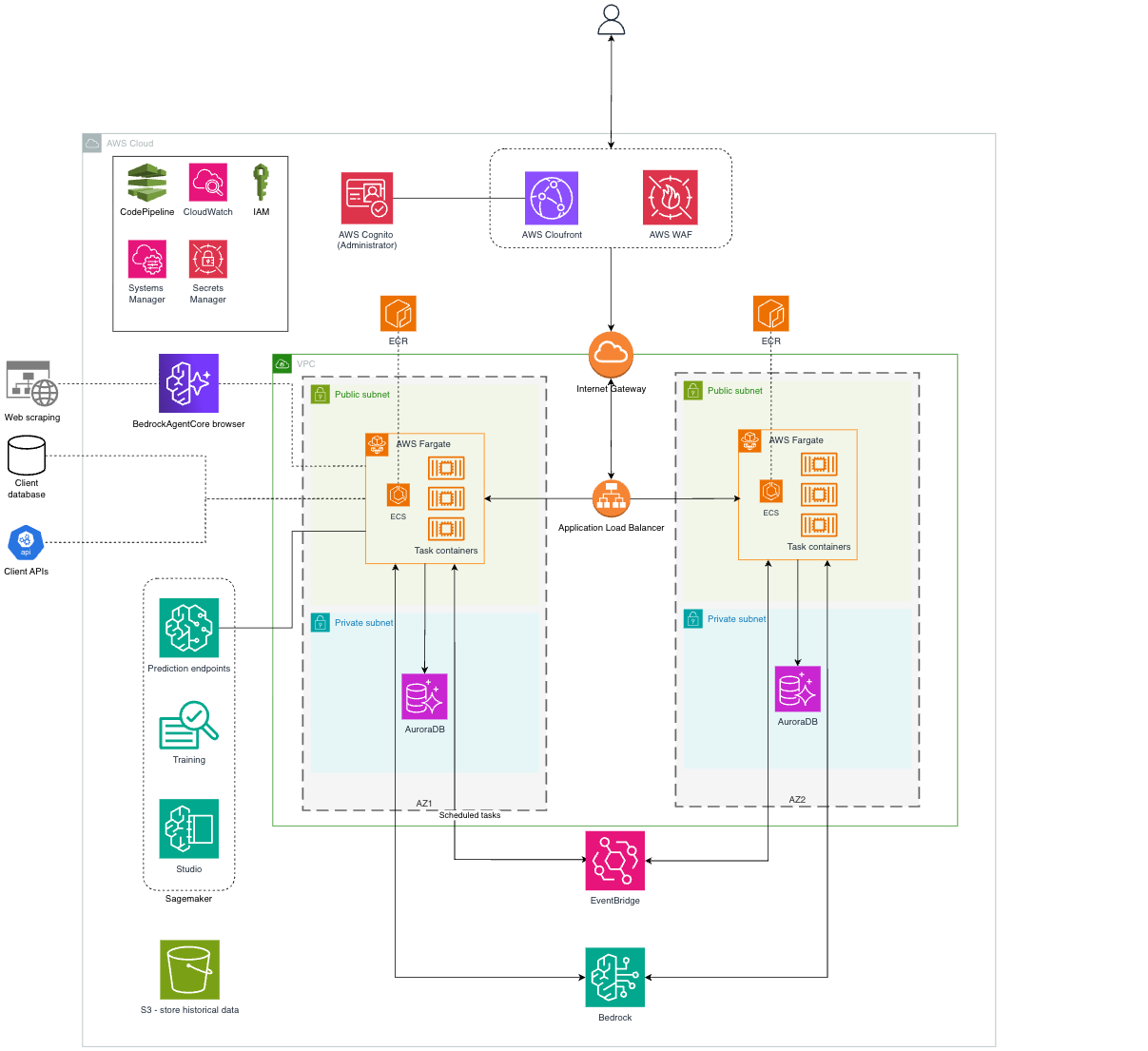 The solution is designed with scalability, security, and real-time performance in mind. AgentCore Browser provides managed browser sessions for competitor data collection, auto-scaling based on monitoring workload. Collected pricing data flows through Lambda for processing, stored in Aurora and S3 for analysis. SageMaker handles price prediction models, while Bedrock powers the conversational AI interface.